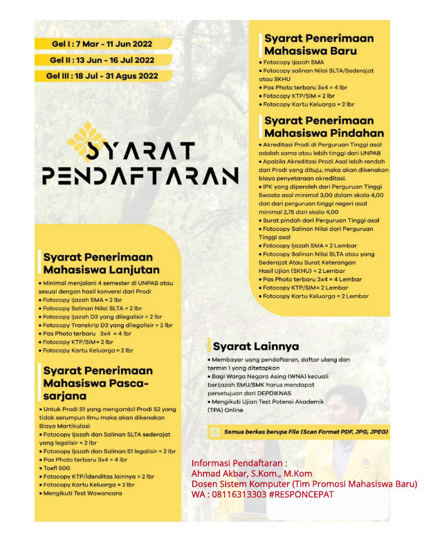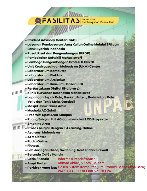 Universitas Pembangunan Panca Budi, Assalamu’alaikum wr.wb Selamat datang di Universitas Pembangunan Panca Budi, Kamu ingin melanjutkan pendidikan ke jenjang yang lebih tinggi, kamu dapat memilih jenjang yang kamu inginkan di sini, mulai dari Diploma (D3), Strata 1 (S1) atau Strata 2 (S2) Dapatkan informasi terkait Penerimaan Mahasiswa Baru (PMB) TA. 2025/2026 di sini mulai dari Persyaratan, biaya dan lainnya untuk Informasi lebih lanjut, silahkan Chat : 08116313303.